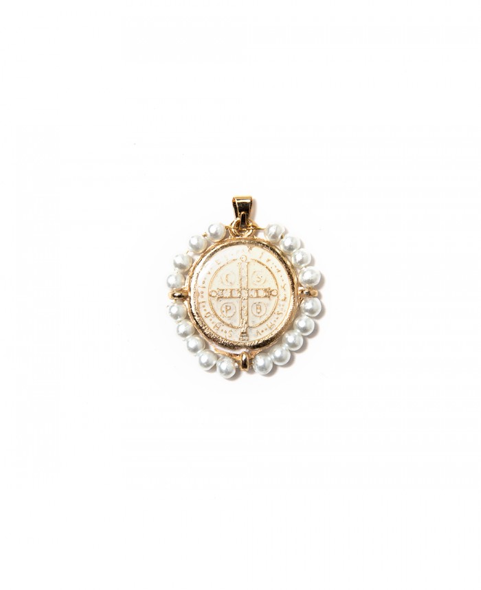 Medalla de San Benito lacada en blanco y rodeada de perlas.