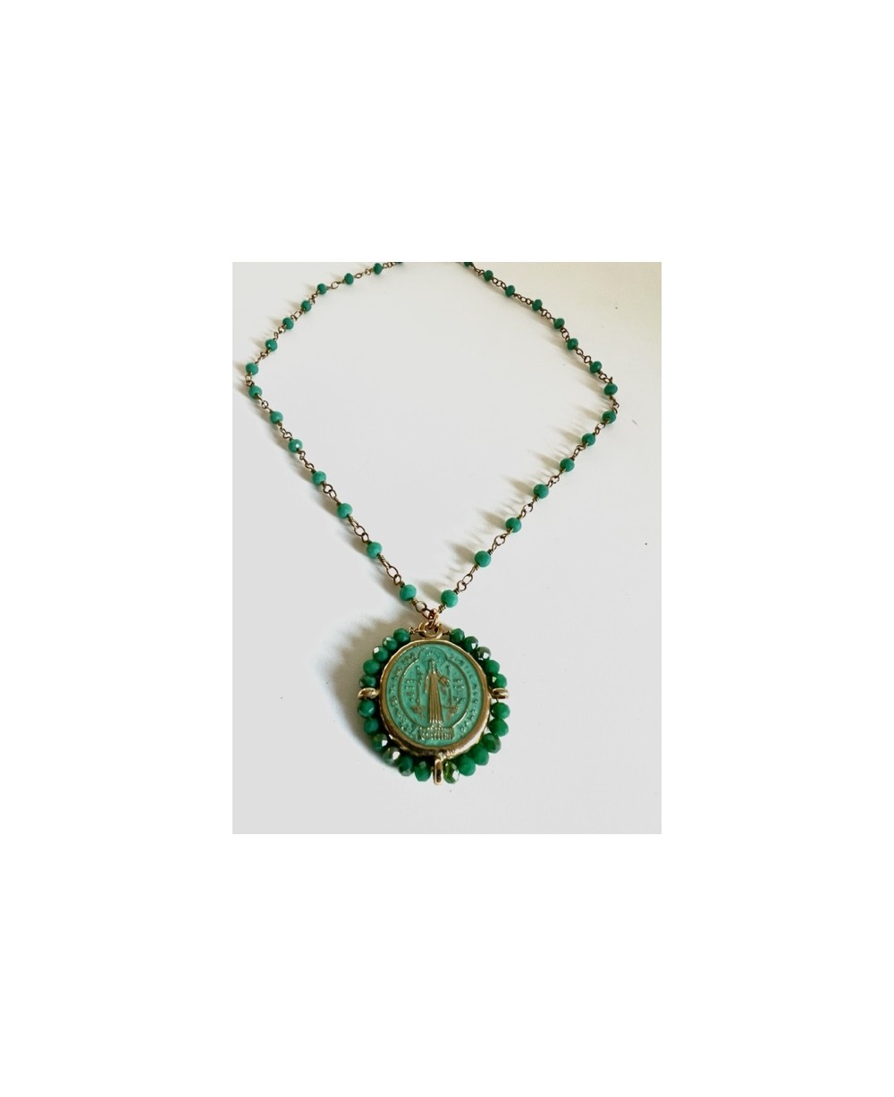 Medalla de San Benito lacada en verde sobre cadena con piedritas en el mismo tono.