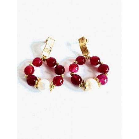 Pendientes con piedras en tono fresa acompañados de una perla blanca. Son de latón bañados en oro.