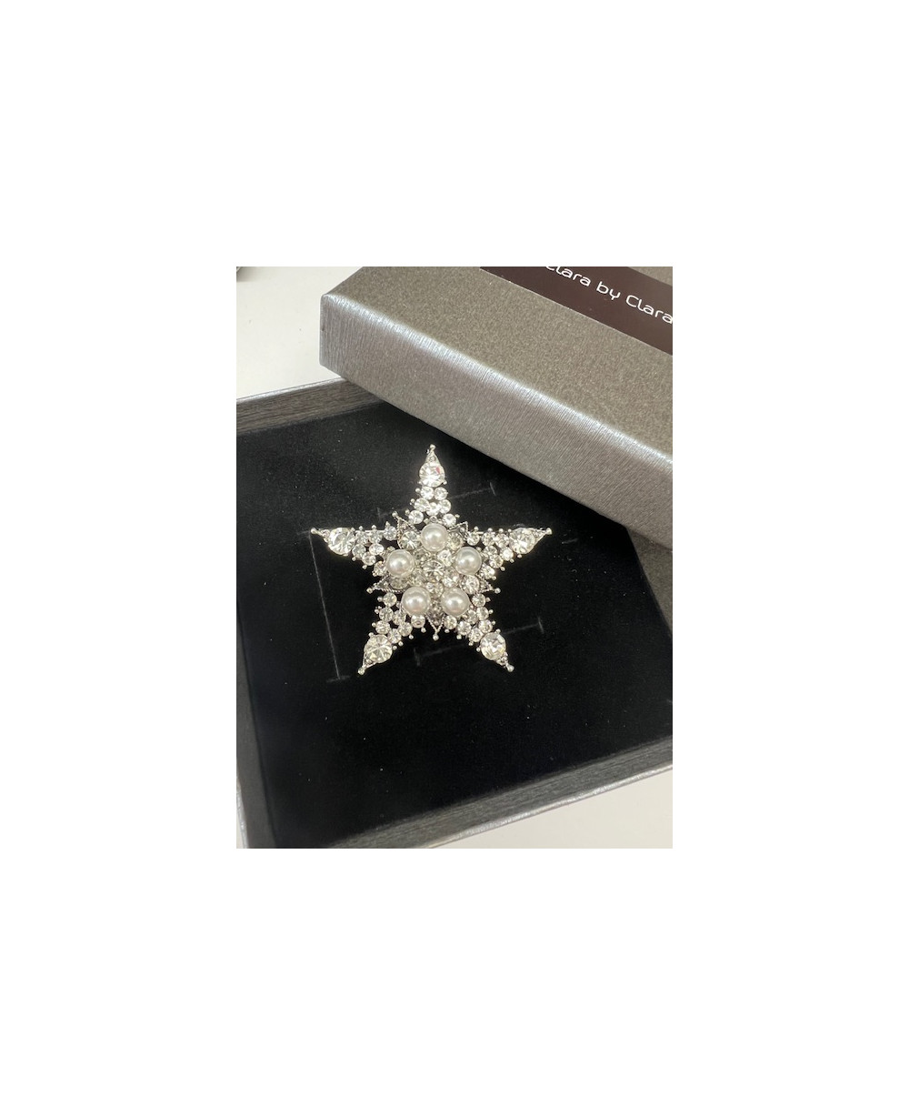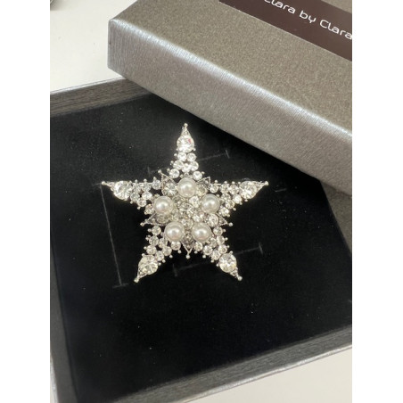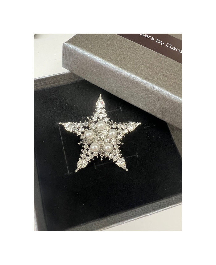 Espectacular broche de estrella en tono plata adornado con brillantitos y perlas blancas.
