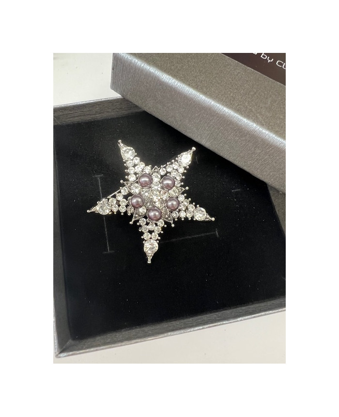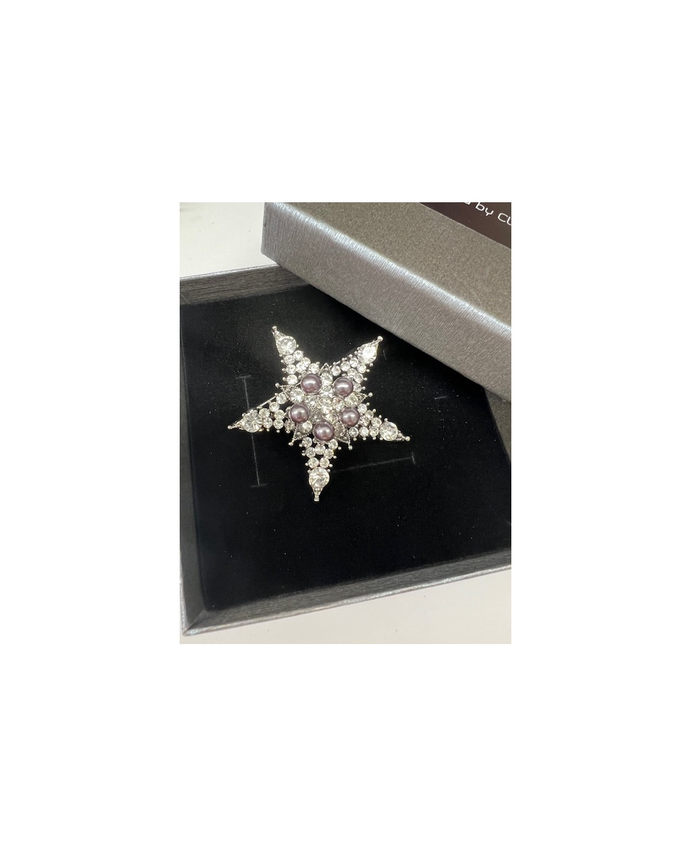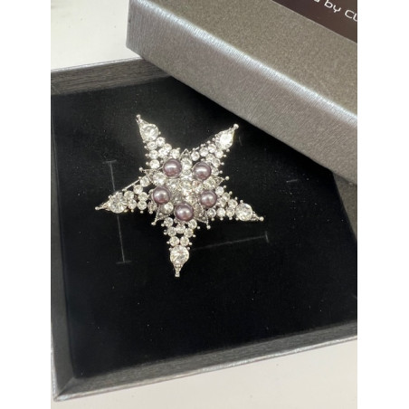 Espectacular broche de estrella en tono plata adornado con brillantitos y perlas grises.