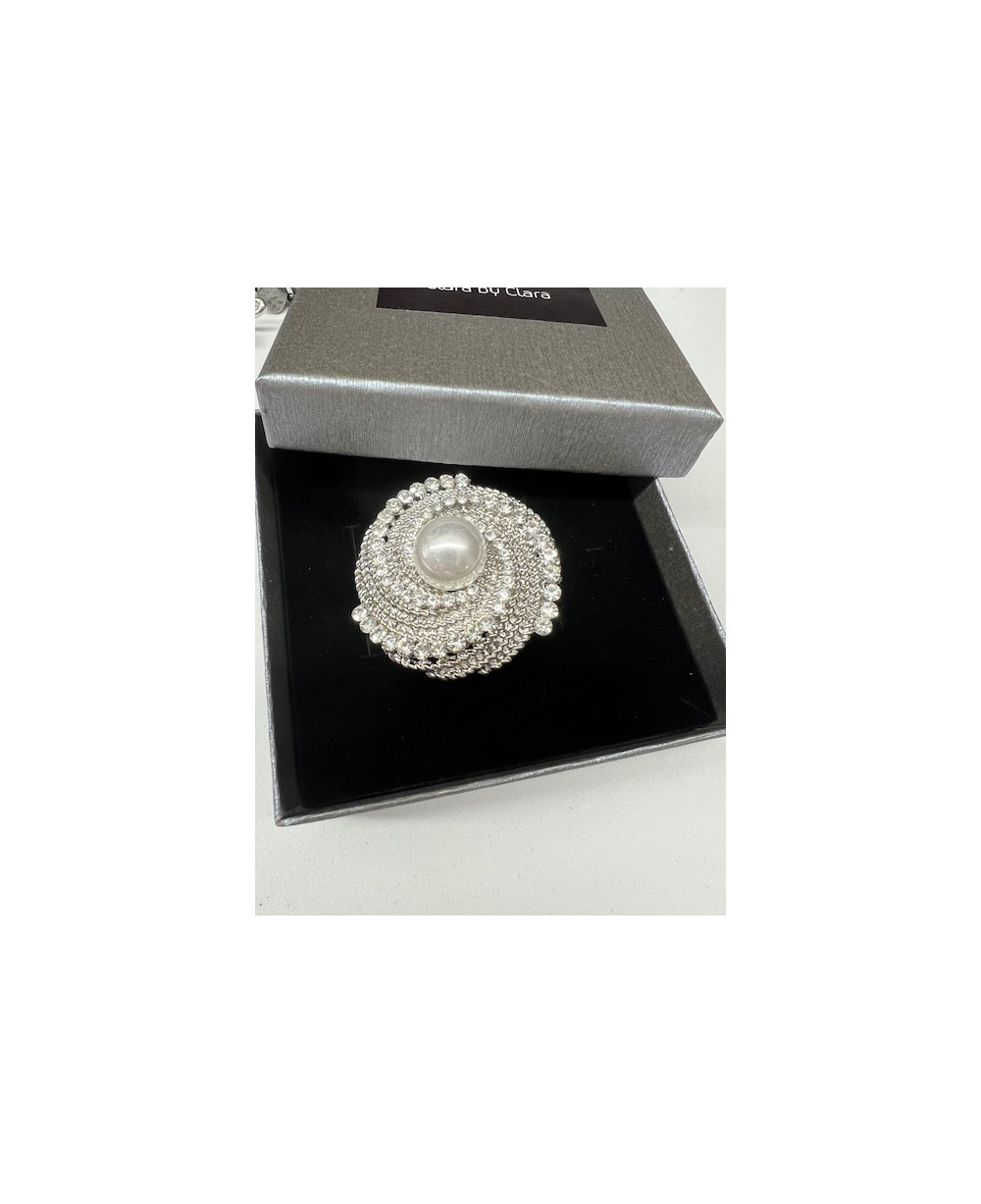 Elegante broche redondo en tono plata adornado con brillantitos y perla central en tono blanco.