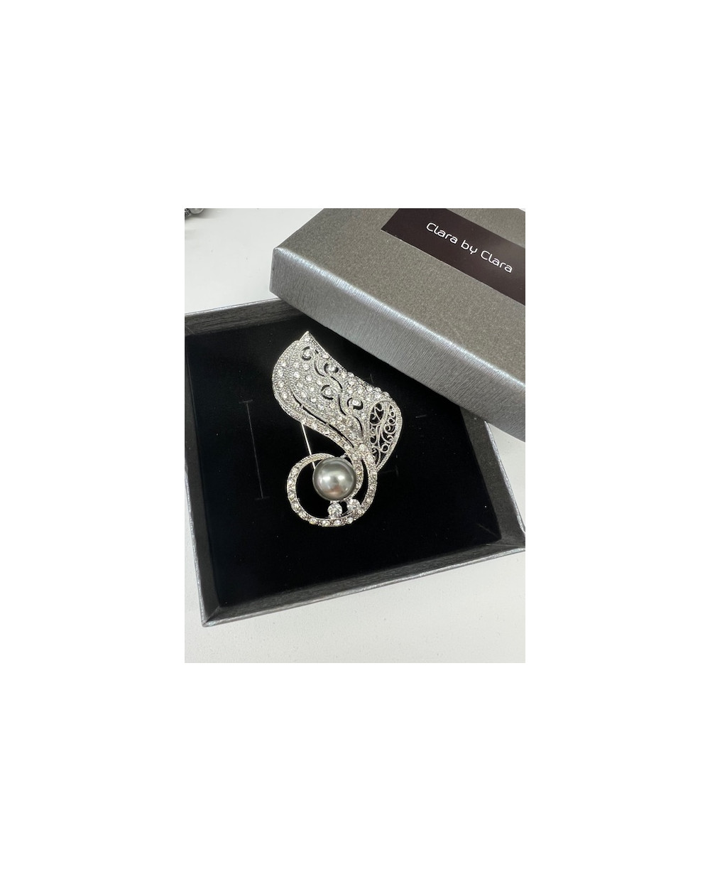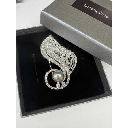 Espectacular broche estilo antiguo en tono plata con brillantitos y adornado por una perla gris de bisutería.