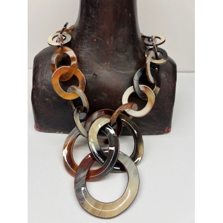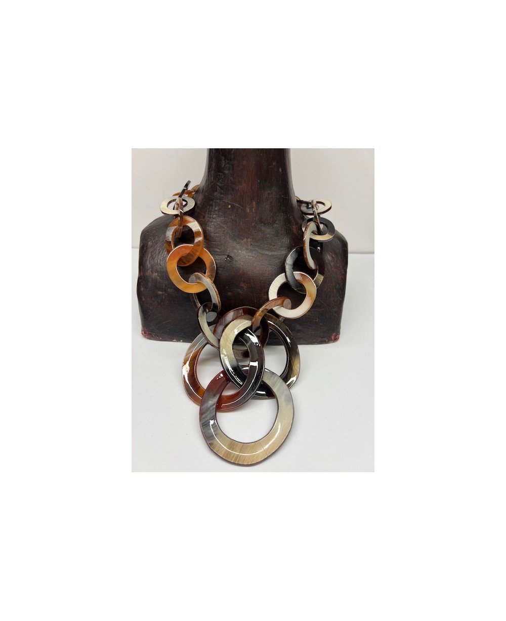 Estiloso collar de arandelas de resina entrelazadas en tonos marrones y beige.