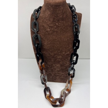 Preciosa cadena de eslabones de resina que combina dos tonos: negro y marrón-carey.