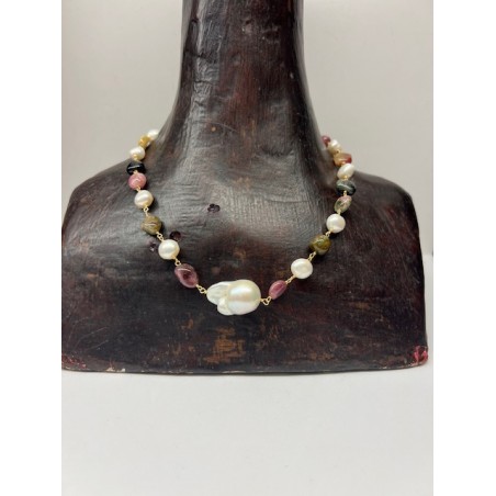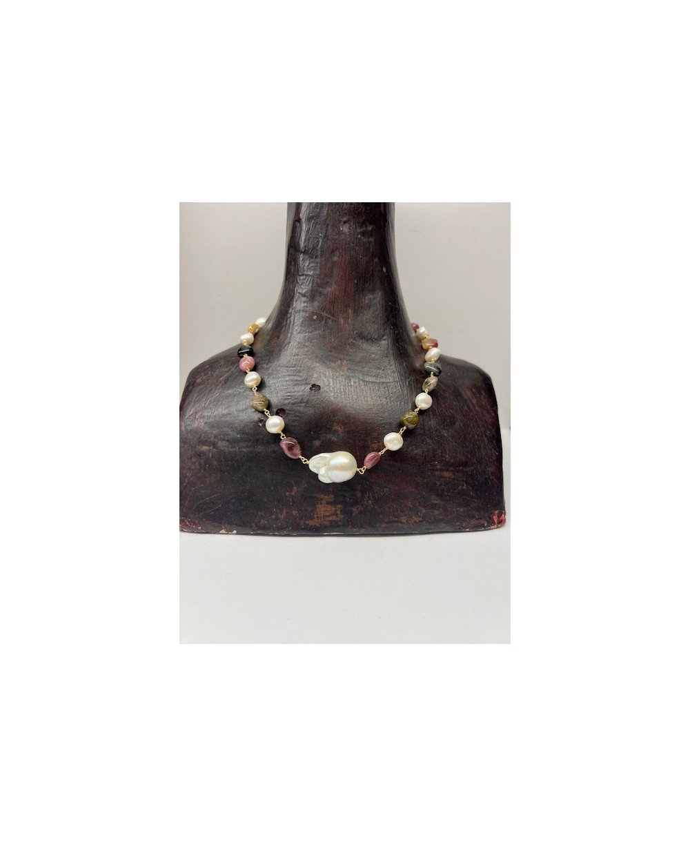 Elegante collar de perlas blancas y turmalinas adornado en el centro por una perla por una perla barroca.