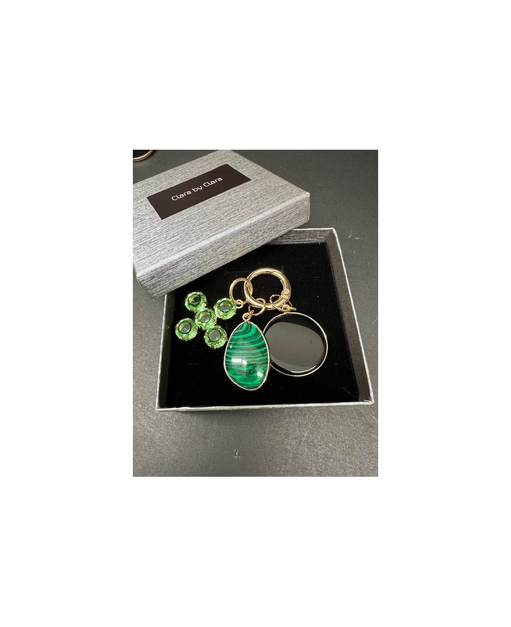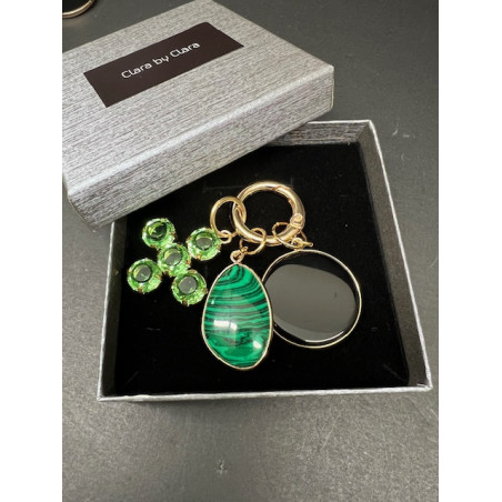 Colgante cruz de cristal en tono verde con dos piedras en tono verde y negro.