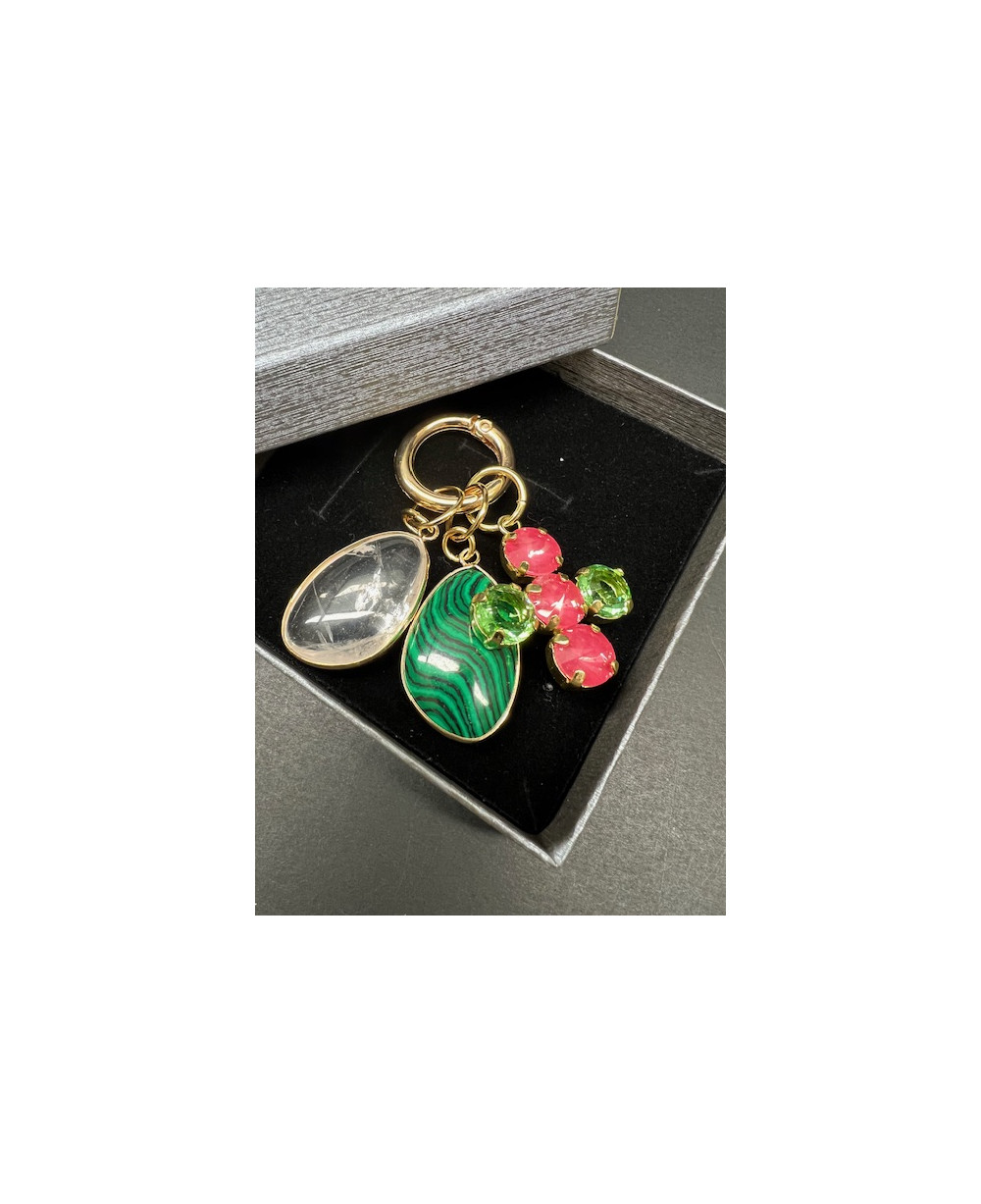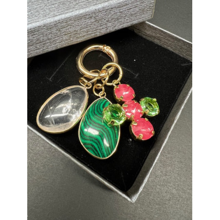Colgante cruz de cristal en tono fucsia-verde con dos piedras en tono verde y cristal.