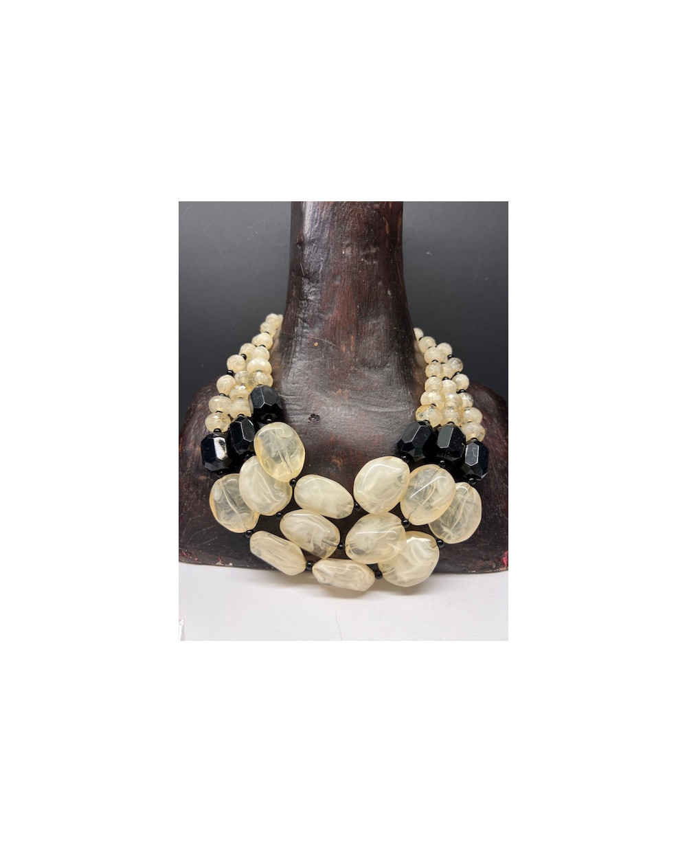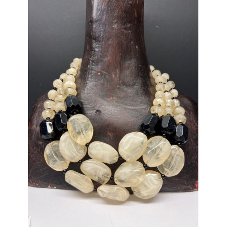 Collar de tres vueltas de piezas de resina en tono beige y negro.
