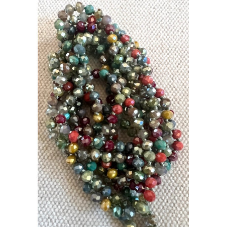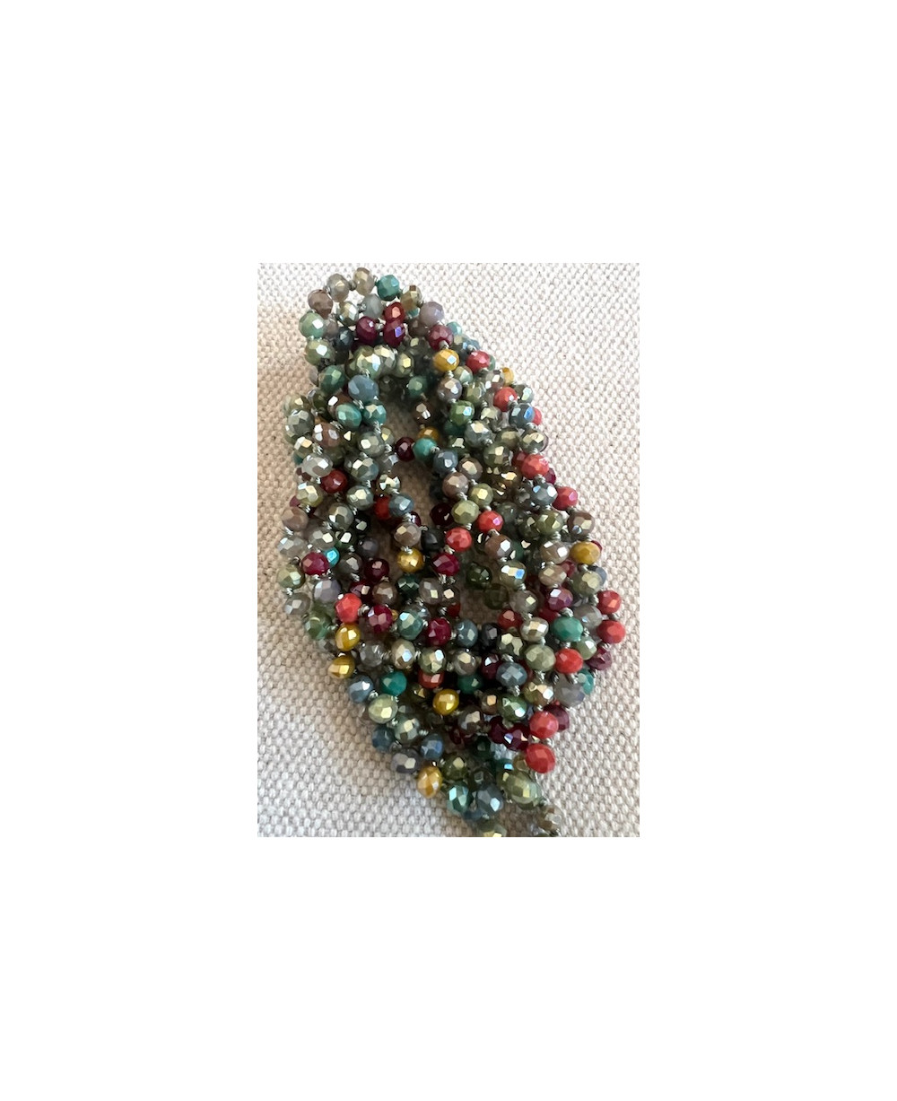 Collar largo formado por cristales facetados pequeños engarzados con nudo. No lleva cierre. Combinación verdes, marrón, naranja y granate.