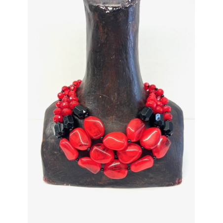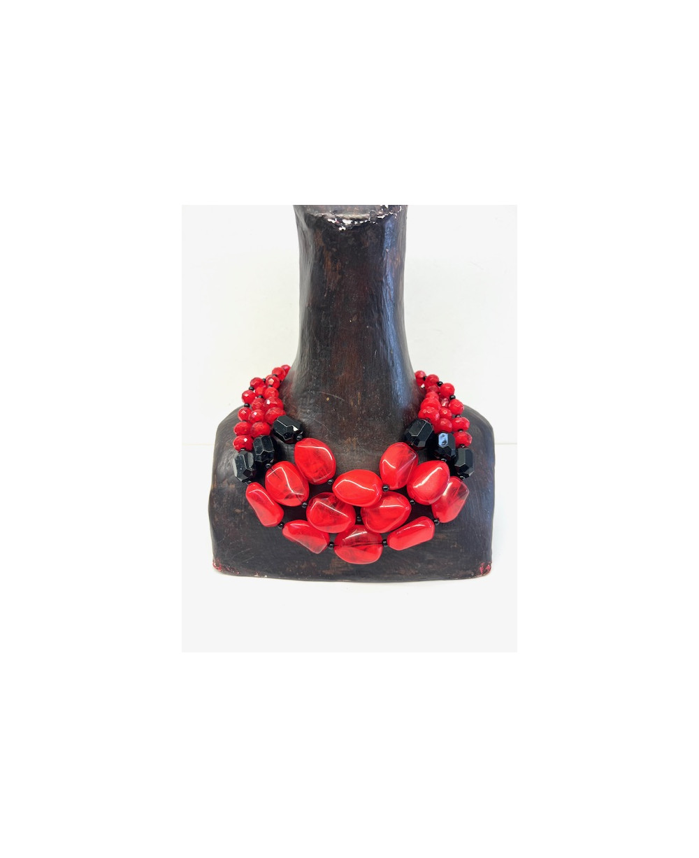 Collar de tres vueltas de piezas de resina en tono rojo y negro.