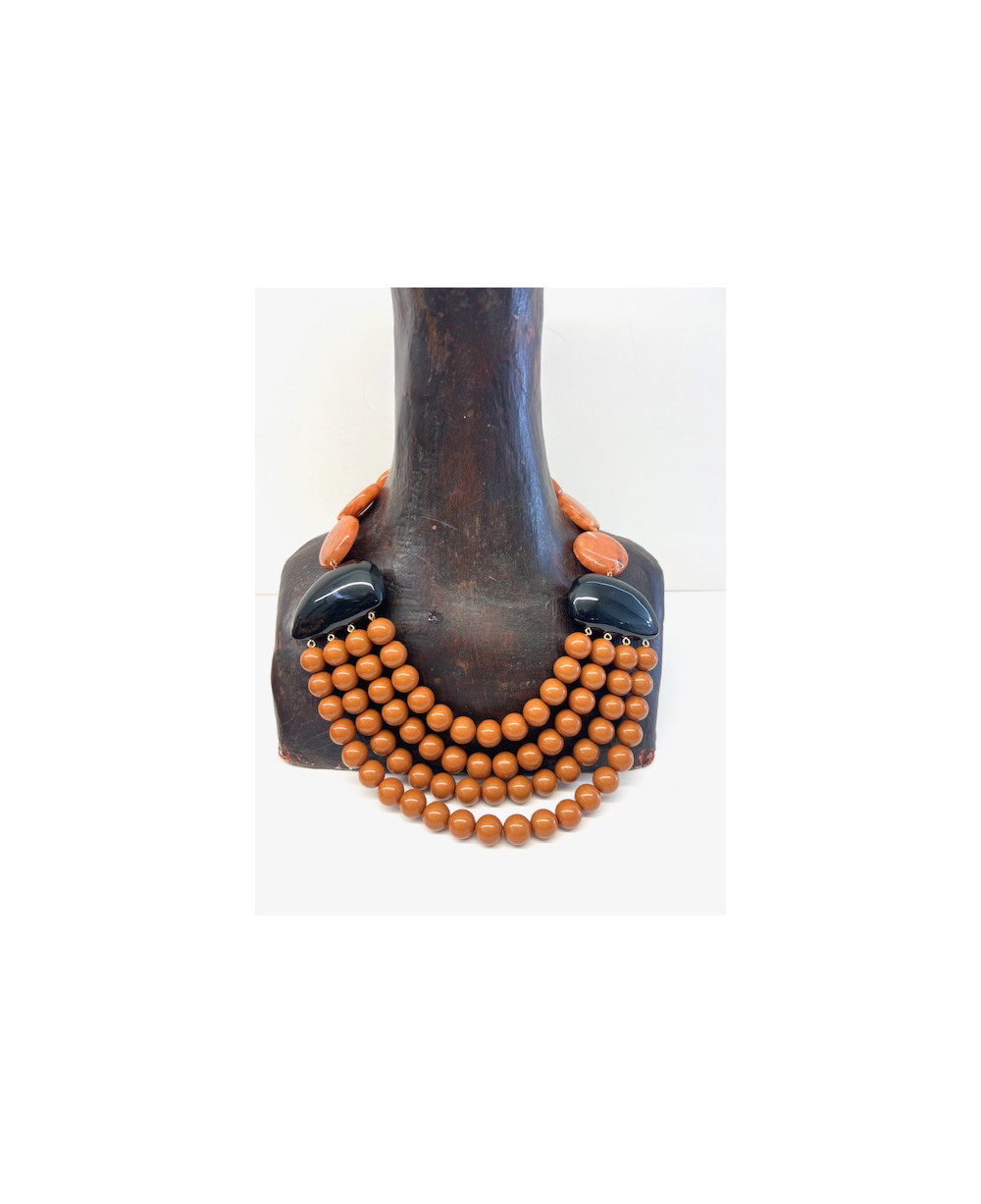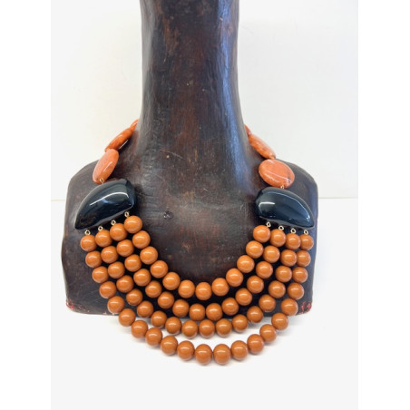 Estiloso collar de cuentas de resina en tono marrón adornado por dos piezas en tono negro.