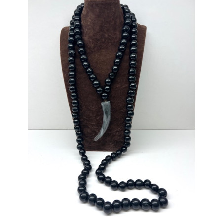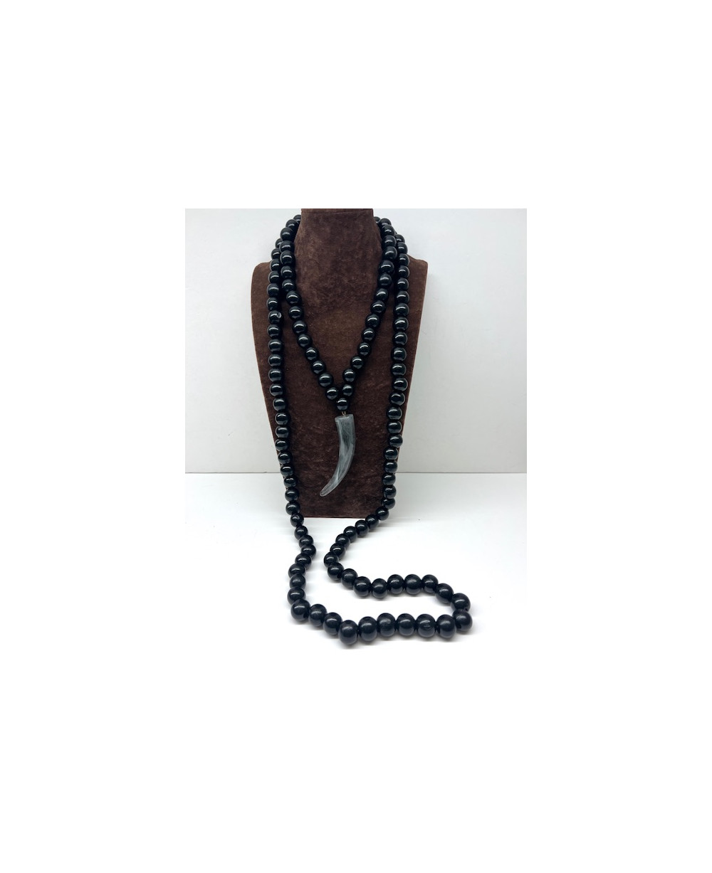 Espectacular collar de bolas de madera en tono negro adornado por un colmillo de resina.