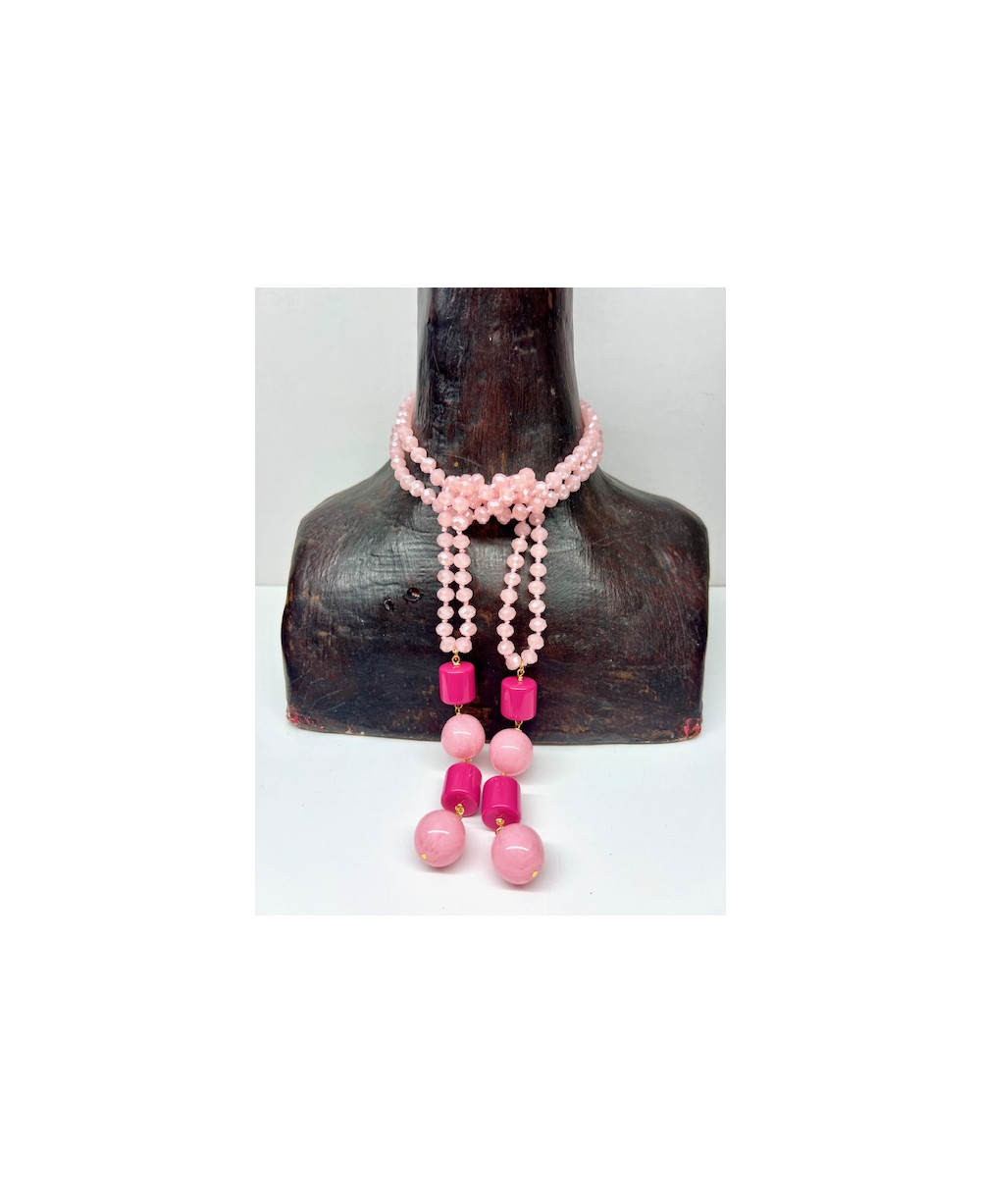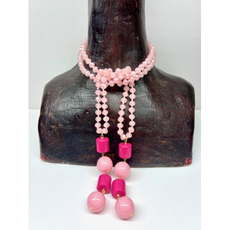 Collar de cristal en tono rosa rematado por dos colgantes formados por piezas de resina.