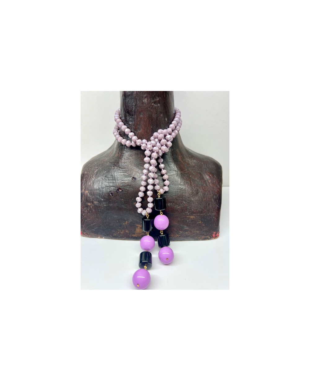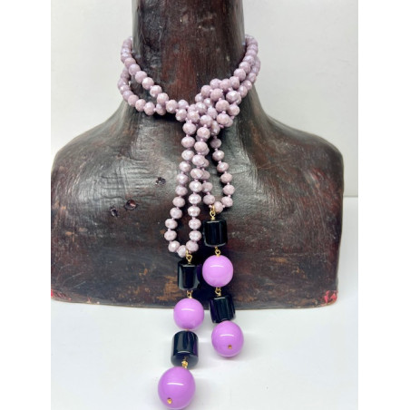 Collar de cristal en tono lila rematado por dos colgantes formados por piezas de resina.