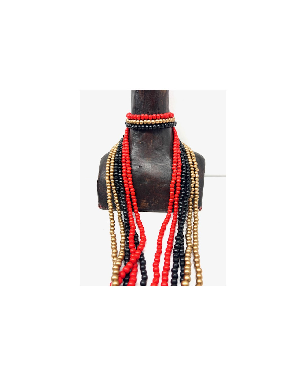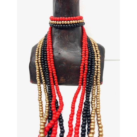 Conjunto de seis collares individuales formados por bolitas de madera muy ligeros. El pack consiste en dos collares rojos, dos negros y dos dorados.